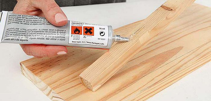 Sau đó, bạn lấy một lượng keo con chó vừa đủ, bỏ ra một nắp sắt hoặc bất kỳ vật dụng nào bằng kim loại rồi pha loãng ra bằng xăng (hoặc một số loại dung môi pha loãng chuyên dụng khác tùy ý). Rồi dùng một cây chổi quét sơn, quét một lượng keo vừa đủ và đều lên bề mặt gỗ chỗ cần dính, ép chặt 2 bề mặt đó lại trong vòng 5 - 7 phút cho keo dính đều 2 bên và dùng băng keo trong cuốn chặt mối dính lại, để yên cố định trong vòng khoảng vài tiếng để mối dính được đảm bảo chắc chắn nhất.